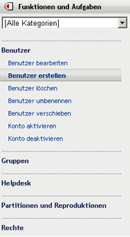 Die Sortierung innerhalb jeder Kategorie wird vom Verfasser des jeweiligen iManager-Plugins bestimmt. Grundlegende Plugin-Aufgaben (dabei handelt es sich um die in iManager selbst enthaltenen Aufgaben) werden in der Regel vor den Aufgaben anderer Plugins angezeigt.