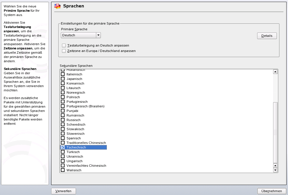Wählen Sie die gewünschten Sprachen aus der Sprachenliste unter . Wenn Sie dieses Dialogfeld mit schließen, installiert YaST die zusätzlichen lokalisierten Softwarepakete. Das System ist mehrsprachig, aber Sie müssen die gewünschte Sprache explizit einstellen, um eine Anwendung in einer von der der Primärsprache abweichenden Sprache zu starten.