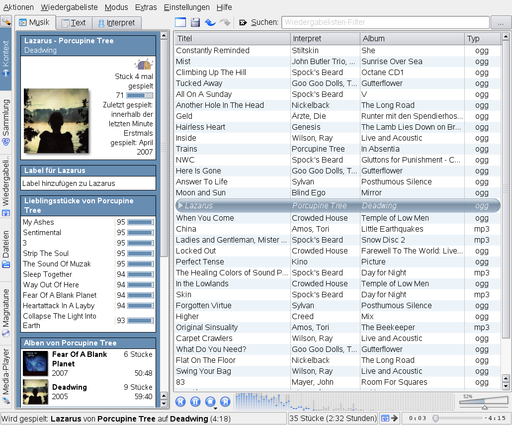 Das Hauptfenster von amaroK zeigt eine Seitenleiste auf der linken Seite, über die Ihnen verschiedene Ansichten zur Verfügung stehen: Ihre Musiksammlung, einen Kontext-Browser, Ihre Wiedergabelisten, einen Dateibrowser usw. Im rechten Teil des Fensters sehen Sie die aktuelle Wiedergabeliste. Ziehen Sie dazu die gewünschten Elemente aus einem beliebigen Browser der Seitenleiste in den Bereich für die Wiedergabelisten. Zum Abspielen eines Elements doppelklicken Sie in der Wiedergabeliste darauf.