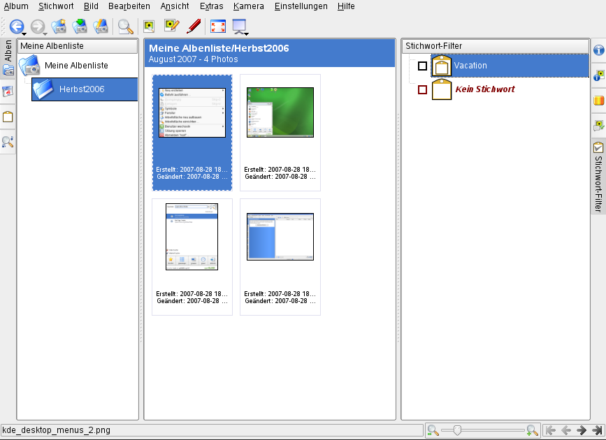 Das Hauptfenster von digiKam enthält eine Baumansicht auf der linken Seite und zeigt Miniaturbilder des Bilder auf der rechten Seite an. Um schnell auf Ihre Bilder zuzugreifen, verwenden Sie die Seitenleiste auf der linken Seite, die es Ihnen ermöglicht, zwischen verschiedenen Ansichten umzuschalten, die Fotos entsprechend der Alben zu sortieren sowie Markierungen, Daten oder Suchen hinzuzufügen. Um in den Anzeige- und Bearbeitungsmodus von digiKam zu wechseln, doppelklicken Sie auf das Miniaturbild eines Fotos.