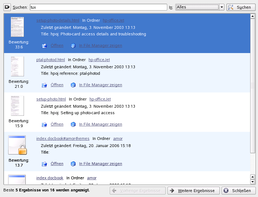 Klicken Sie auf das Symbol , um die Suche zu starten. Das Suchergebnis wird im Fenster angezeigt. Verwenden Sie die Links im Ergebnis, um das Ergebnis direkt zu öffnen oder seinen Standort im Dateisystem mit dem Datei-Manager anzuzeigen.