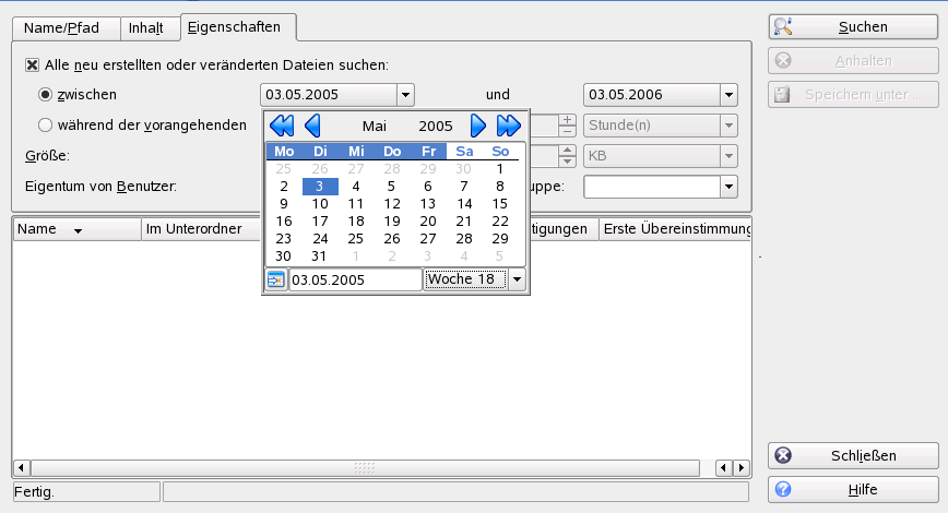 Wenn Sie nach Eigenschaften, wie dem Erstellungs- oder Änderungsdatum einer Datei, suchen möchten, klicken Sie auf die Registerkarte und wählen Sie die gewünschten Optionen aus.