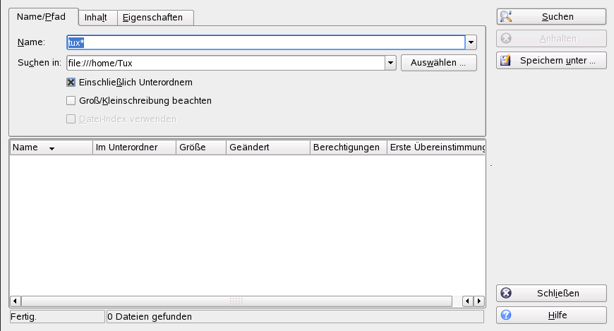 Geben Sie auf dem Karteireiter mindestens den Pfad an, unter dem die Datei gesucht werden soll. Sie können das Feld leer lassen.