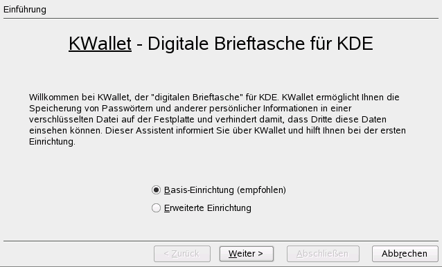 Wenn Sie auswählen, dass Passwörter in einer KDE-Anwendung nach der ersten Anmeldung gespeichert werden sollen (für Ihr E-Mail-Konto, beispielsweise), wird der KWallet-Assistent standardmäßig gestartet. KWallet ist ein Tool zur Passwort-Verwaltung, das alle Passwörter sammeln und sie in einer verschlüsselten Datei speichern kann.