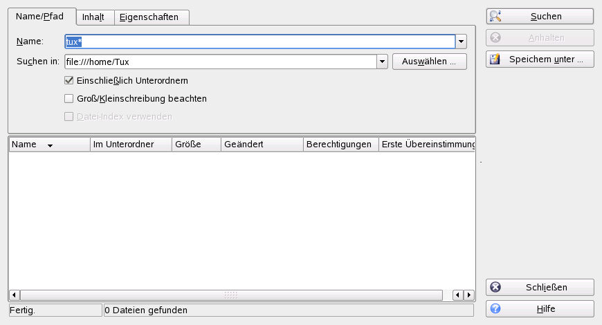 Geben Sie auf dem Karteireiter mindestens den Pfad an, unter dem die Datei gesucht werden soll. Sie können das Feld leer lassen.