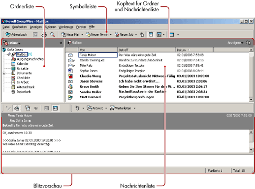 Der Hauptarbeitsbereich in GroupWise wird als Hauptfenster bezeichnet. Im Hauptfenster können Sie Ihre Nachrichten lesen, Termine planen, Ihren Kalender anzeigen, Kontakte verwalten, den Modus ändern, in dem GroupWise ausgeführt wird, Ordner und Dokumente öffnen und vieles mehr.