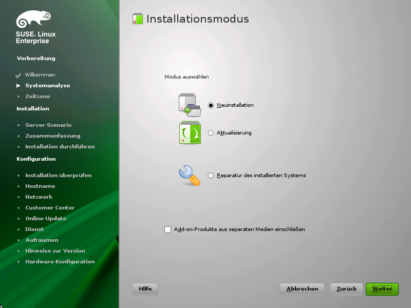 Nach einer Systemanalyse, bei der YaST nach Speichergeräten und weiteren auf dem Computer installierten Systemen sucht, werden die verfügbaren Installationsmodi angezeigt.