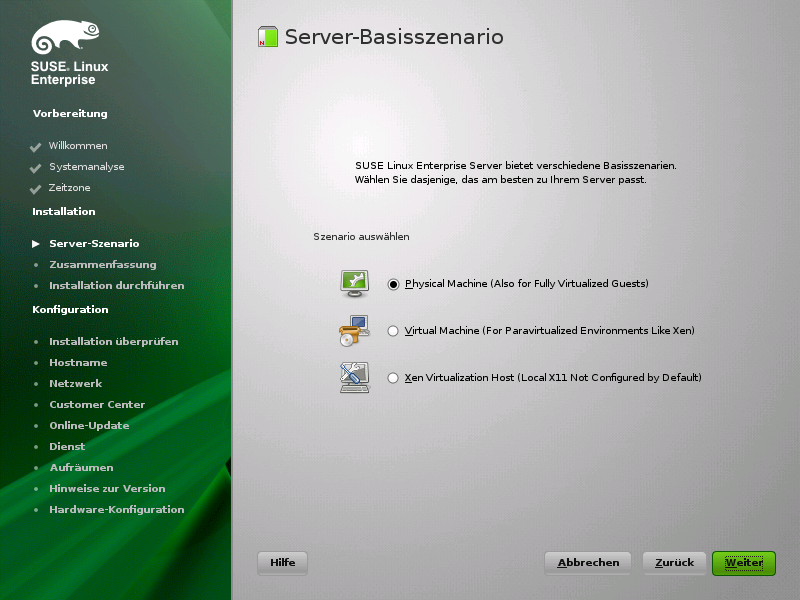 In SUSE Linux Enterprise Server können Sie aus drei Basis-Szenarien wählen. Das ausgewählte Szenario beeinflusst die Paketauswahl.