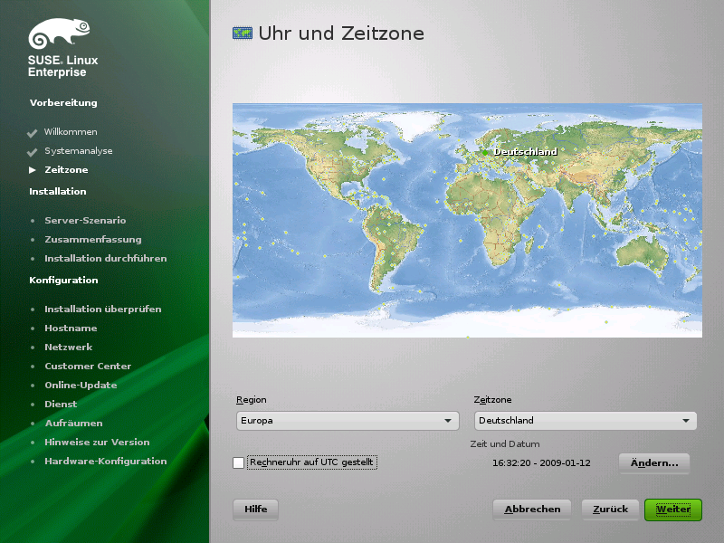 In diesem Dialogfeld können Sie Ihre Region und Zeitzone wählen. Beide Werte werden entsprechend der ausgewählten Installationssprache festgelegt. Um die festgelegten Werte zu ändern, verwenden Sie entweder die Landkarte oder die Dropdown-Listen für die und die . Wenn Sie die Landkarte verwenden, zeigen Sie mit dem Cursor in die ungefähre Richtung Ihrer Region und betätigen Sie die linke Maustaste, um zu zoomen. Wählen Sie nun Ihr Land oder Ihre Region, indem Sie die linke Maustaste betätigen. Betätigen Sie die rechte Maustaste, um zur Weltkarte zurückzukehren.