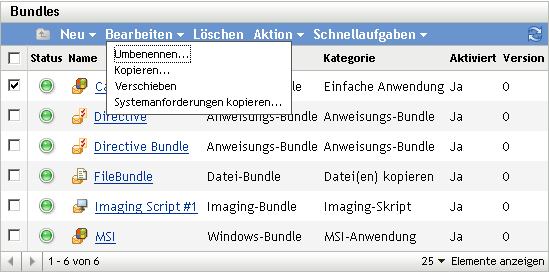 Verwenden Sie die Dropdown-Liste auf der Seite „Bundles“, um ein bestehendes Objekt zu bearbeiten. Um auf die Dropdown-Liste zuzugreifen, müssen Sie ein Objekt wählen, indem Sie das Kontrollkästchen neben dem Objektnamen in der Liste aktivieren.