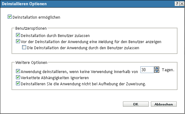 Abbrechen der Deinstallation der Anwendung durch den Benutzer zulassen: Wählen Sie diese Option aus, um anzugeben, ob der Benutzer die Deinstallation der Anwendung abbrechen kann. Sie können diese Option nur aktivieren, wenn die Option aktiviert wurde.