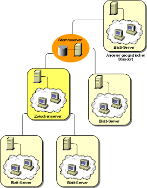 In dieser Konfiguration führen die Blattserver ein Roll-up von Daten zum nächsthöheren Zwischenserver und schließlich zum Stammserver durch. Außerdem ist ein weiterer Inventarserver von einem anderen Standort mit dem Stammserver verbunden.