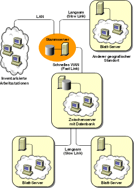 In dieser Konfiguration sind die Inventarserver über langsame WAN-Verbindungen mit dem Zwischenserver verbunden. Der Zwischenserver verfügt außerdem über eine Inventardatenbank und überträgt die Informationen zum Stammserver. Andere Inventarserver sind ebenfalls mit dem Stammserver verbunden.