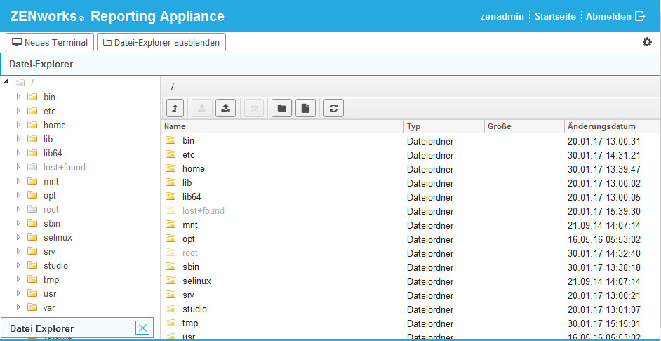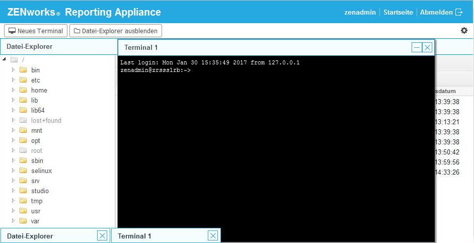 </theme>Klicken Sie auf der ZENworks Reporting Appliance-Startseite unter ZENworks Reporting auf Terminal und Datei-Explorer.