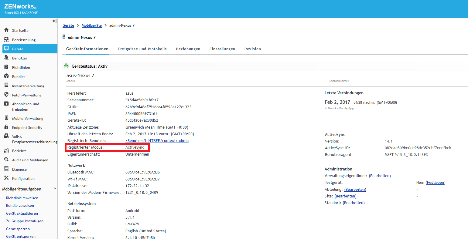 Sobald Sie das Gerät registriert haben, wird der Modus, in dem die Registrierung erfolgte, auf der Seite „Geräteinformationen“ angezeigt. So öffnen Sie diese Seite: