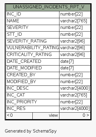 | View ESEC.ESECDBA.UNASSIGNED_INCIDENTS_RPT_V | Generated by SchemaSpy |