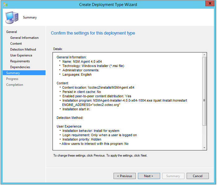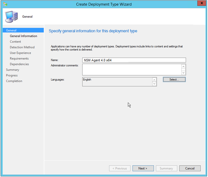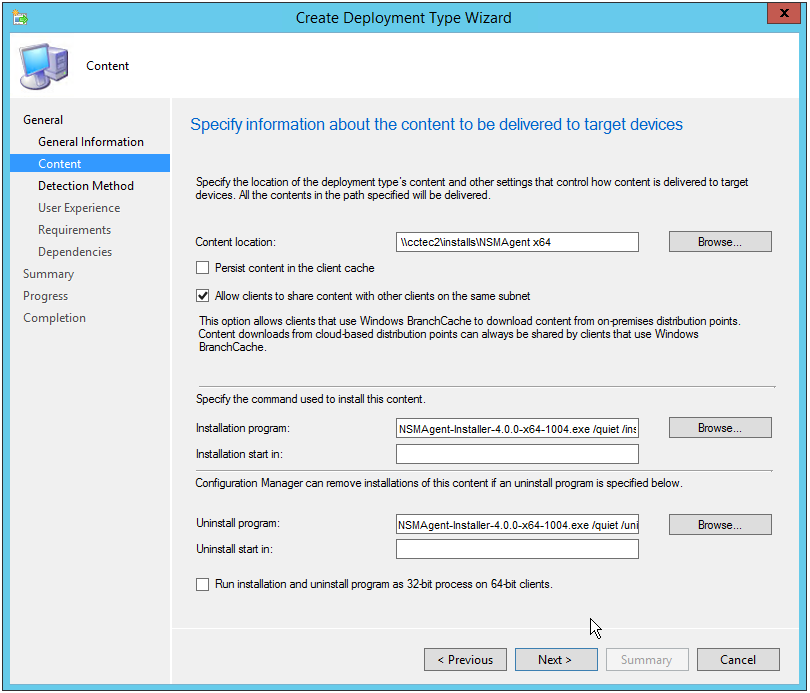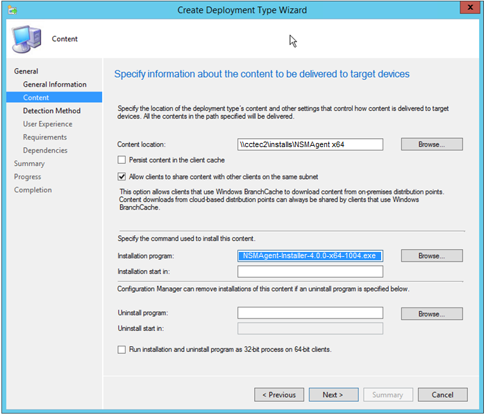 Because SCCM does not have an option for automatically detecting bootstrapped executable installation packages (such as the NSM Agent installation executable), you will need to manually specify the file.