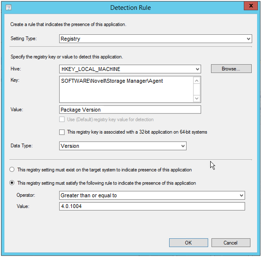 Verify that the This registry setting must satisfy the following rule to indicate the presence of this application option is selected.