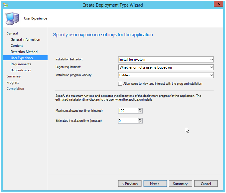 In the Specify user experience settings for the application page, make the following recommended settings: