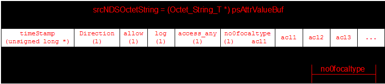 It shows that the first field in the buffer contains the timestamp and the size is an unsigned long. The second field is direction and the size is 1. The rest should be easy to follow. The number of acl fields is determined by the value of noOfacltype. Each acl field contains some information about the act, including the data (see the following figure).