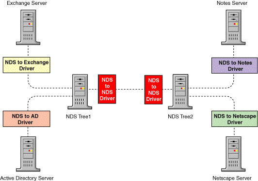 If a change occurs in one application, that change is propagated to the others. For example, if a user name is changed in the Netscape directory, the DirXML drivers propagate the change to the other five applications: Active Directory, eDirectory Tree1, eDirectory Tree2, Notes, and Exchange.