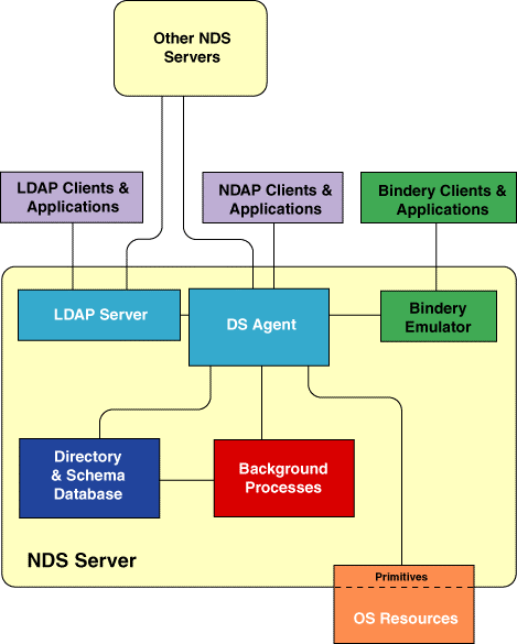 The NDS server accesses operating system resources, such as disk space and memory, through a primitive layer interface. This layer isolates this functionality so that NDS can be implemented on multiple operating systems such as NetWare, NT, and Solaris.