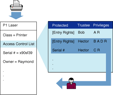 The following figure shows how an access control list operates. In the figure, an ACL entry has been defined for a printer object. Attributes defined for the printer include the class, the ACL, the serial number, and the owner.