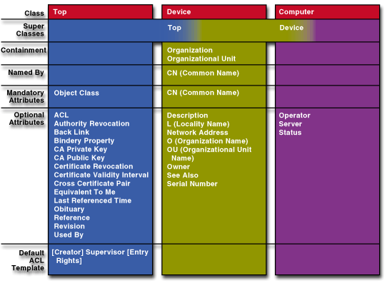 According to the object class definition, a Computer object could appear only as a subordinate of objects belonging to either the Organization or the Organizational Unit class. The object would be recognized by its common name and might be assigned various optional attributes. In this case, Computer refines the definition of the Device to serve a particular class of devices.