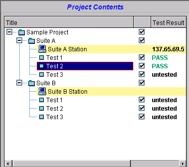 There are three columns in the Project Contents panel. The first column displays the title of the test. The second column indicates whether the test is selected to be run as part of a group. The third column indicates the final test result (untested, pass, fail, etc.).