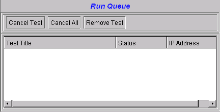 The Run Queue panel displays the tests that are currently running or queued to run. It displays the test name, its running status and the IP address of the test station.