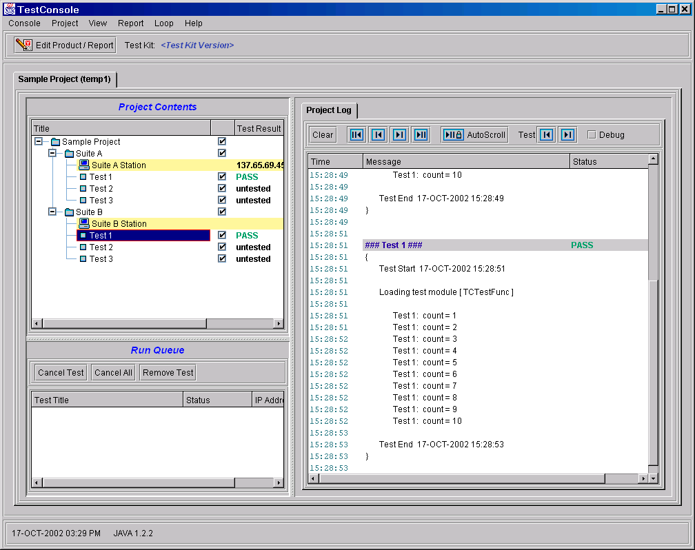 Figure 3-4 Shows the Run Queue panel of the TestConsole window.