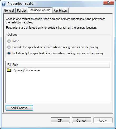 The Include/Exclude setting applies only to the policies for the pair that are run against the primary path. That is, the Include/Exclude feature applies to policies that are moving data with a setting of .