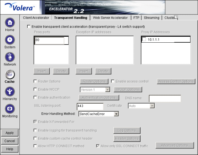 Enable Transparent Client Acceleration (Transparent Proxy---L4 Switch Support): Enables the appliance to handle transparent proxy services. You must also check the IP addresses for this service in Cache > Client Accelerator > the Proxy IP Addresses list.