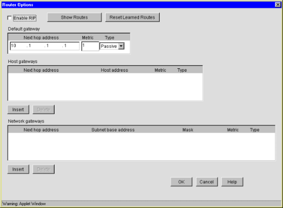 The Router Options dialog box lets you set up static routes and cause the appliance to maintain and use RIP tables.