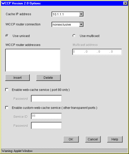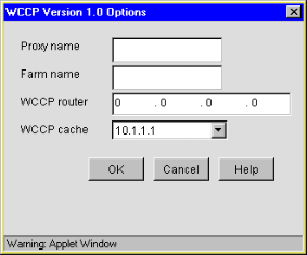 Enable WCCP: Enables WCCP-capable routers to route HTTP requests to the appliance. You must also select the version of WCCP used by the routers and configure WCCP options so that routers can recognize the appliance and know how to work with it. For more information, see WCCP Version 1.0 Options Dialog Box and WCCP Version 2.0 Options Dialog Box.