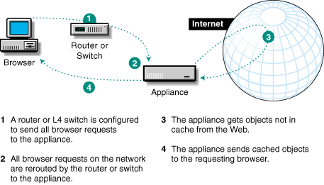 Another method for accelerating content delivery to browsers is to configure a router or switch on the network to route all HTTP traffic to a transparent proxy service you have set up on the appliance.