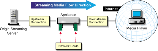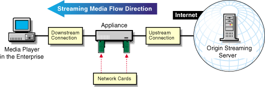 One simple way to remember the difference between upstream and downstream is to think of the media stream as being similar to a stream of water. The media comes toward the appliance from upstream (the origin streaming server), passes through the appliance, and flows downstream to the players that have requested it.