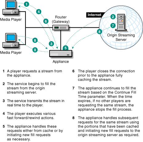 When a player requests a streaming media object, the appliance caches the media stream exactly as it comes to the player. Because of fast forward requests and other user actions, only part of the stream may be cached.
