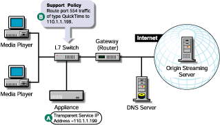 An L7 switch on the same network as the client workstation intercepts media player requests from the client, identifies which requests are for QuickTime content, and sends only those requests to the appliance. (Other streaming media requests are sent to the target origin streaming server.) The transparent streaming proxy service processes the QuickTime requests for the players.