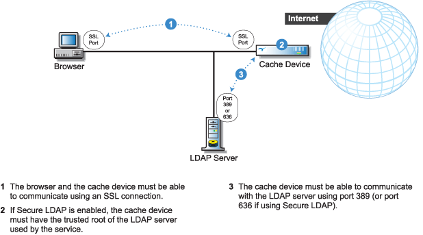 Type the port number on which the LDAP server will listen for requests from the cache device. The default ports are: 389 for non-secure access and 636 for secure (SSL) access.