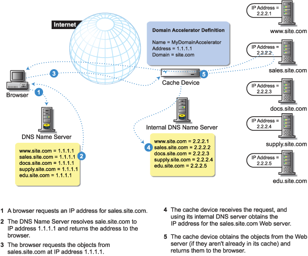 Figure 48 presents a basic overview of a single Excelerator cache device accelerating five Web servers in a single domain through a single domain-based acceleration service.