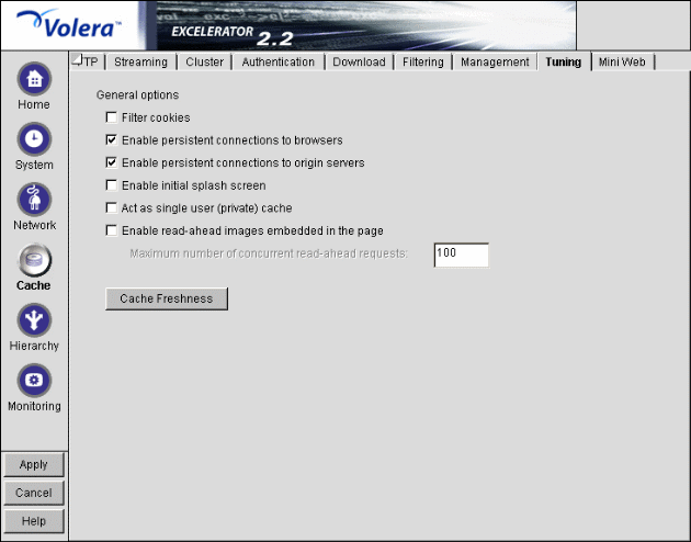 The Cache Freshness dialog box lets you set time values governing when Excelerator revalidates requested cached objects against those on their respective origin Web servers. If requested objects have changed, Excelerator re-caches them. Default field values are shown in Figure 150.
