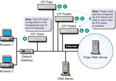 See C in Figure 43. As you define peers and parents for the appliance, you are building the ICP hierarchy. Having ICP peers is optional. An appliance could have only ICP parents. For more information, see ICP Peer Dialog Box. |