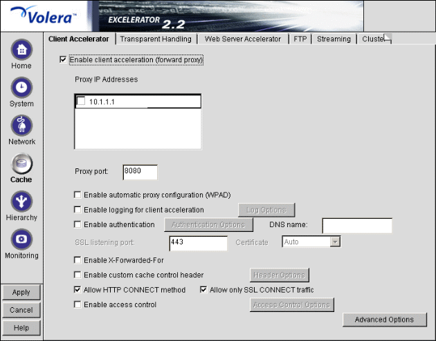 The Client Accelerator tab lets you configure the appliance as a forward proxy server. It lets you specify which IP addresses receive forward proxy requests from browsers and the ports that the appliance listens on for forward requests.