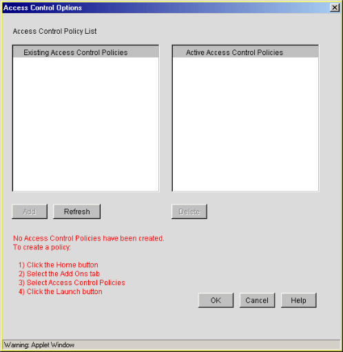 The Access Control Options dialog box lets you assign access control policies to the proxy service through which you accessed the box. You assign policies to the service by selecting a profile in the Existing Access Control Policies list and clicking Add. The policy then moves to the Active Access Control Policies list. Use the Delete button to remove policies from the active list.
