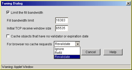 The Tuning dialog box lets you control the initial and subsequent TCP receive window size for cache device fills from origin Web servers, the caching of objects on the cache device that would not normally be cached, and the filling and vending of browser no-cache requests by the cache device.
