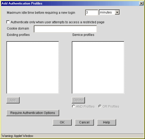 Service Profiles: The authentication profiles that are active for the proxy service you are configuring. You add a profile to the list by clicking a profile in the Existing Profiles list and then clicking Add. You can remove the profile from this list using the Delete button.