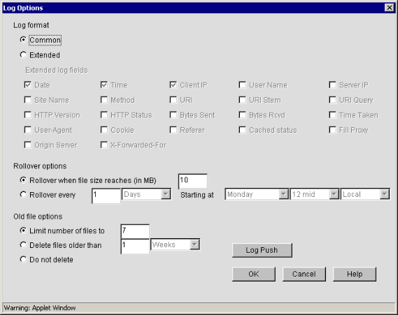 Push Logs When the Logs Roll Over: When this option is selected, log files are immediately downloaded and deleted when they are closed by a rollover operation.