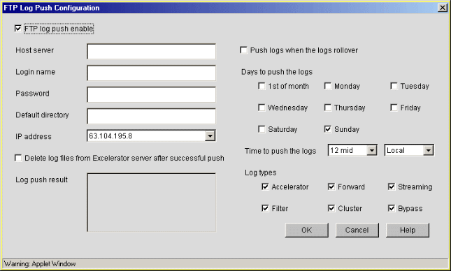 IMPORTANT: Although this dialog box is accessed through the service-specific Log Options dialog boxes, FTP log push is a global feature that affects all log files on the appliance.