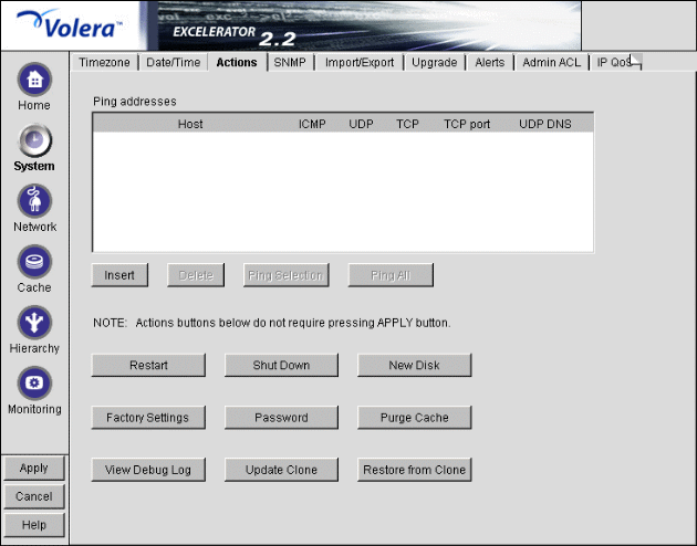 NOTE: Most changes made in the browser-based management tool are not effective until you click Apply. Changes made in the Actions tab, however, are effective immediately.
